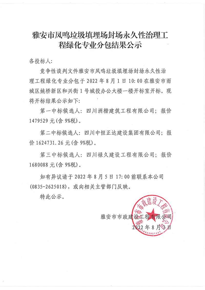 雅安市鳳鳴垃圾填埋場(chǎng)封場(chǎng)永久性治理工程項(xiàng)目綠化專業(yè)分包結(jié)果公示