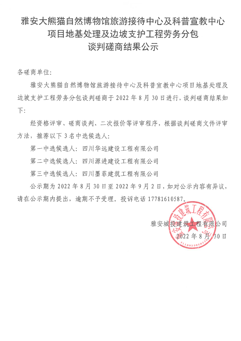 雅安大熊貓自然博物館旅游接待中心及科普宣教中心項目地基處理及邊坡支護工程勞務分包談判磋商結果公示