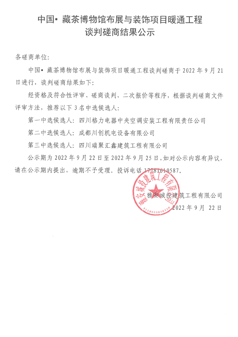 中國• 藏茶博物館布展與裝飾項(xiàng)目暖通工程談判磋商結(jié)果公示