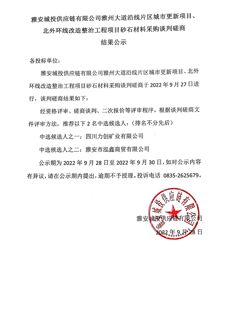 雅安城投供應(yīng)鏈有限公司雅州大道沿線片區(qū)城市更新項(xiàng)目砂石材料采購談判磋商結(jié)果公示
