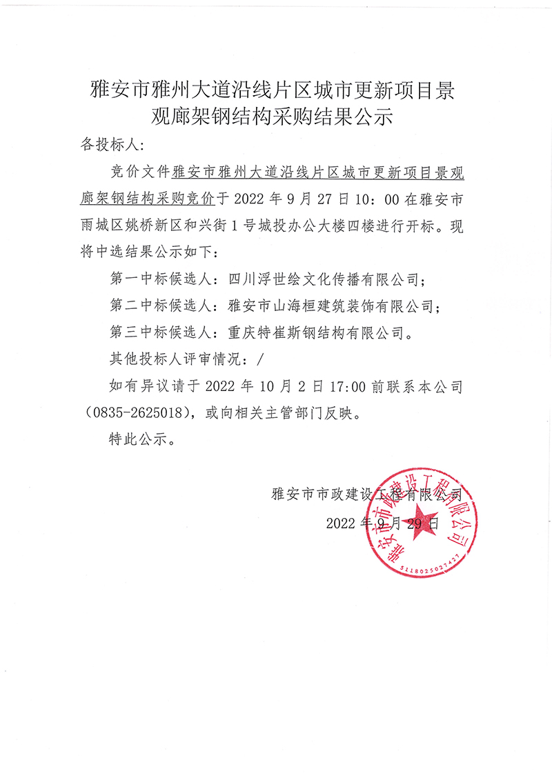 雅安市雅州大道沿線片區(qū)城市更新項目景觀廊架鋼結(jié)構(gòu)采購結(jié)果公示