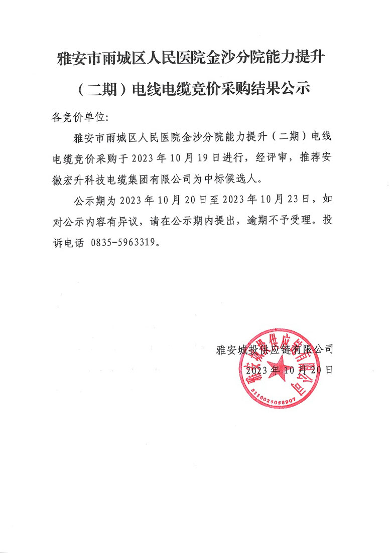 雅安市雨城區(qū)人民醫(yī)院金沙分院能力提升(二期)電線電纜競價采購結(jié)果公示
