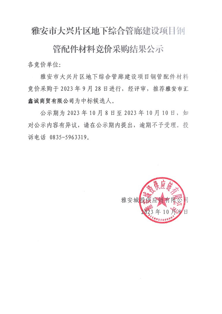 雅安市大興片區(qū)地下綜合管廊建設(shè)項(xiàng)目鋼管配件材料競價(jià)采購結(jié)果公示