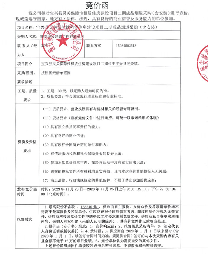 寶興縣靈關(guān)保障性租賃住房建設(shè)項目二期成品煙道采購(含安裝)競價公告