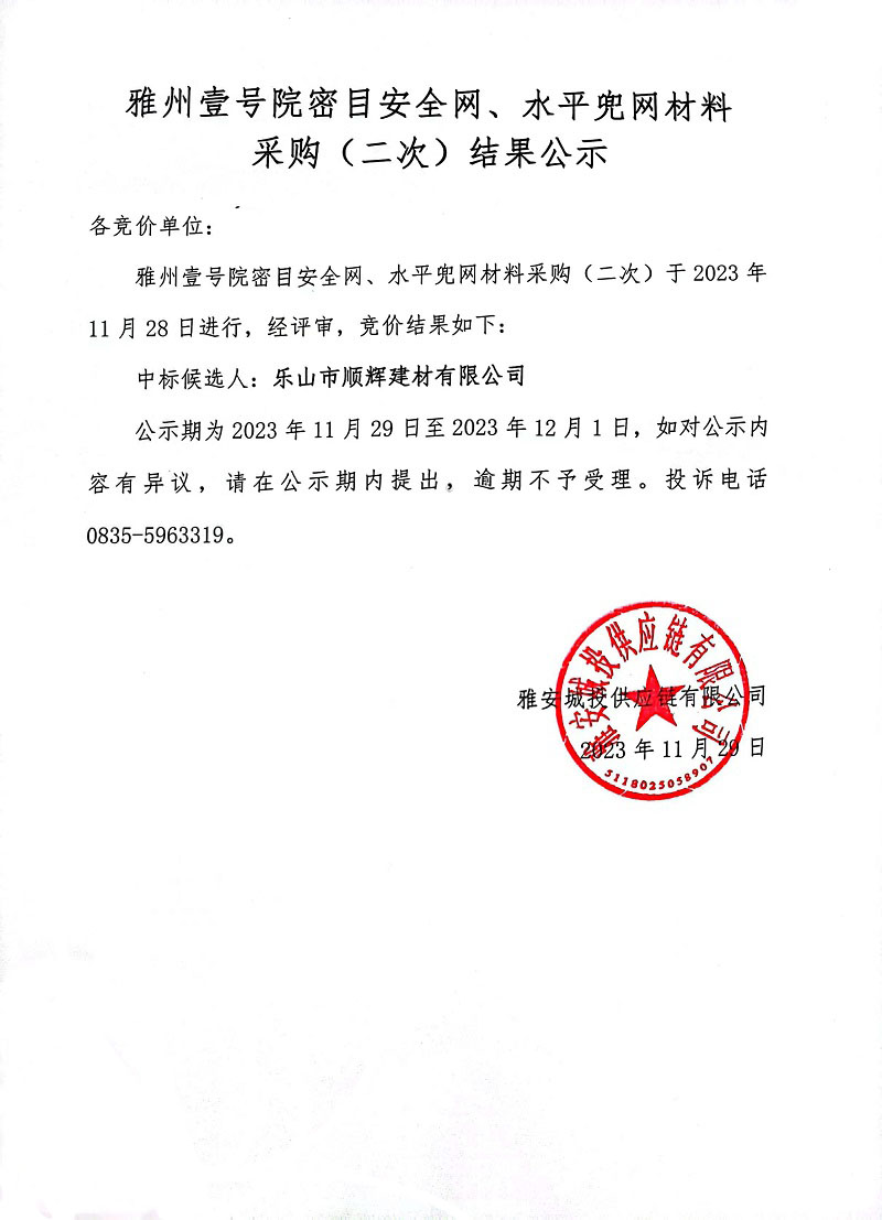 雅州壹號院密目安全網(wǎng)、水平兜網(wǎng)材料采購(二次)結(jié)果公示