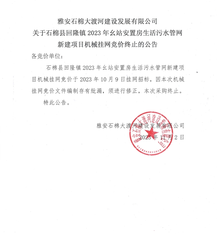 雅安石棉大渡河建設(shè)發(fā)展有限公司關(guān)于石棉縣回隆鎮(zhèn)2023年幺站安置房生活污水管網(wǎng)新建項目機械掛網(wǎng)競價終止的公告