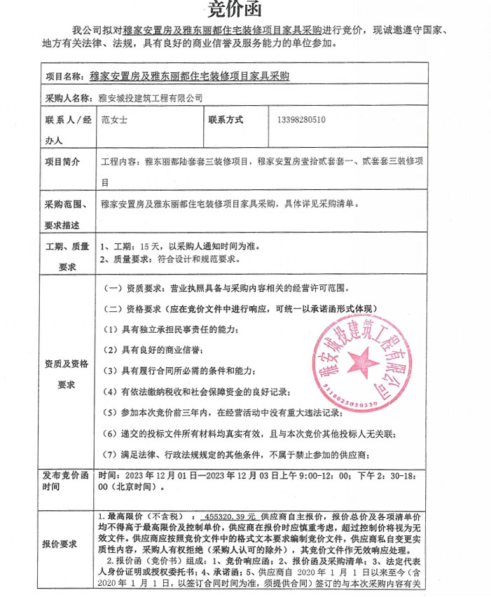 穆家安置房及雅東麗都住宅裝修項(xiàng)目家具采購競價(jià)公告