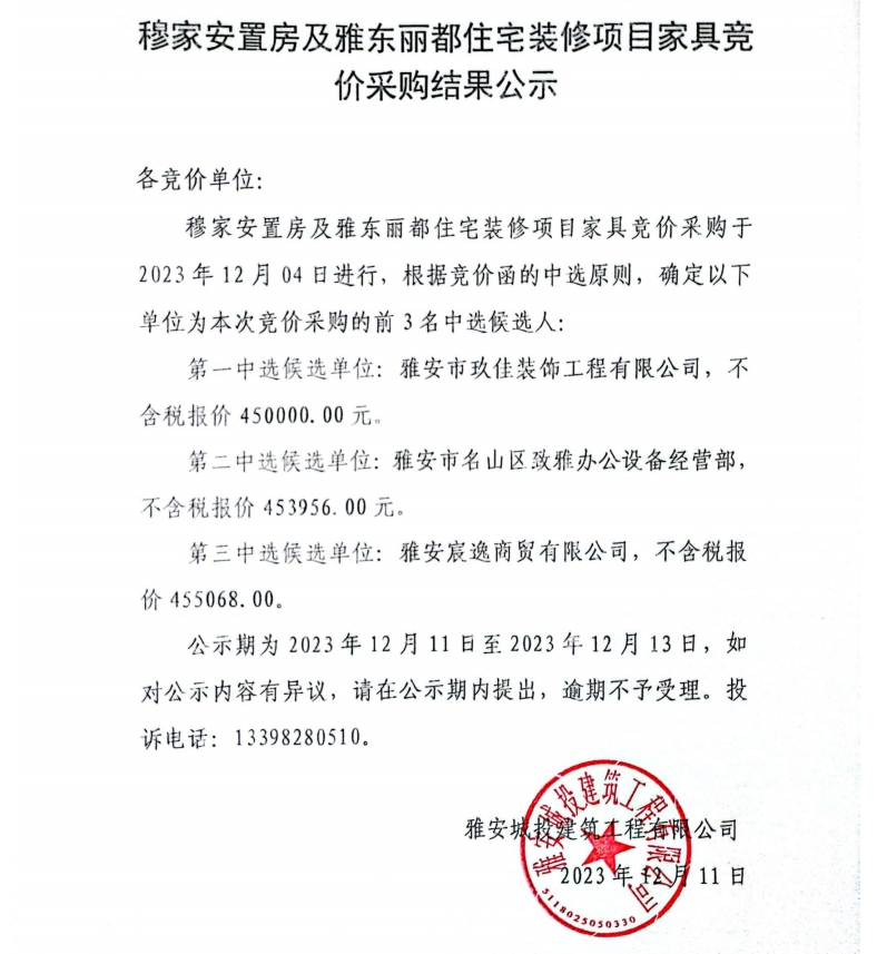 穆家安置房及雅東麗都住宅裝修項(xiàng)目家具采購(gòu)競(jìng)價(jià)采購(gòu)結(jié)果公示