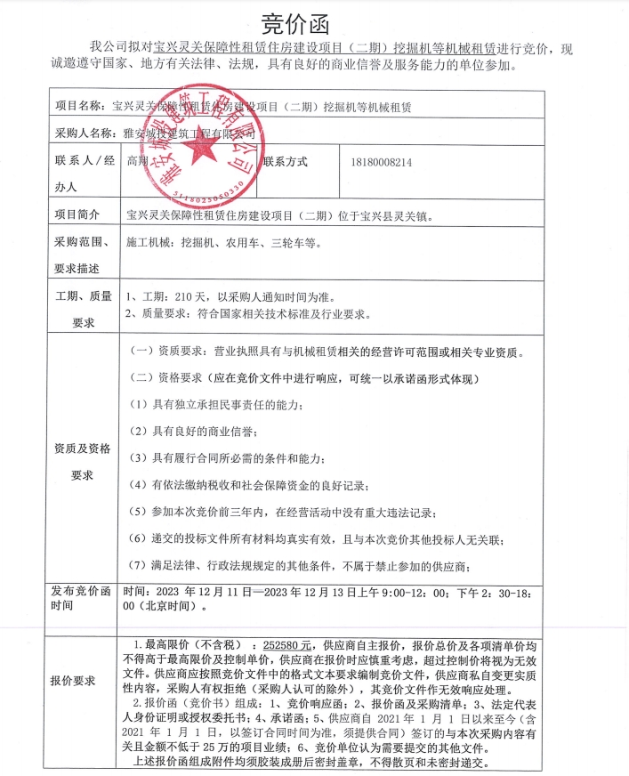 寶興靈關(guān)保障性租賃住房建設(shè)項目(二期)挖掘機等機械租賃競價公告