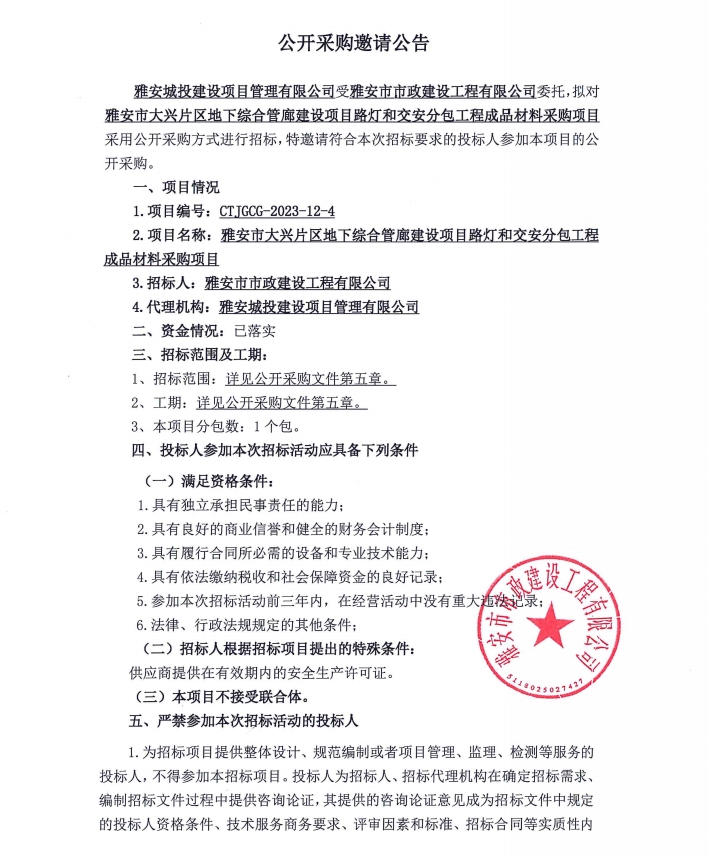 雅安市大興片區(qū)地下綜合管廊建設(shè)項目路燈和交安分包工程成品材料采購項目公開采購邀請公告