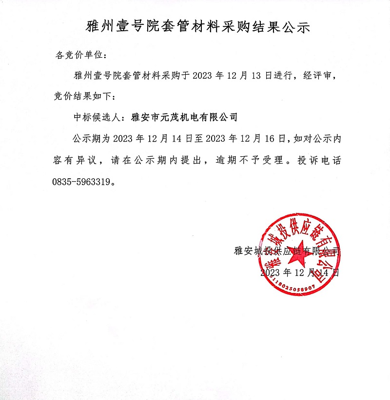 雅州壹號(hào)院套管材料采購結(jié)果公示