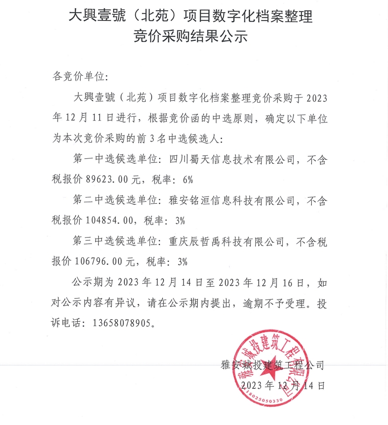 大興壹號(北苑)項(xiàng)目數(shù)字化檔案整理競價(jià)采購結(jié)果公示