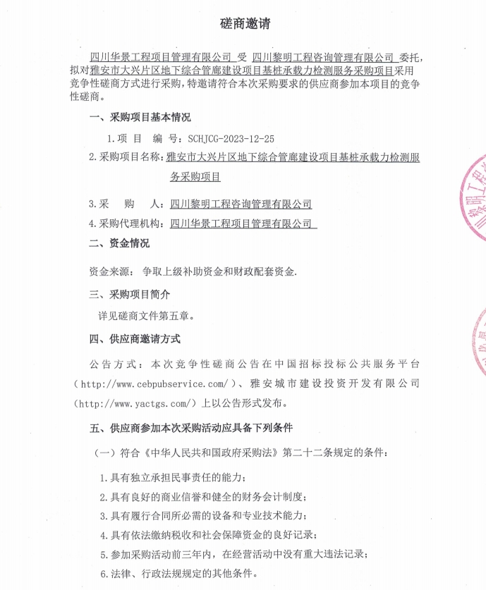 雅安市大興片區(qū)地下綜合管廊建設項目基樁承載力檢測服務采購項目磋商邀請公告
