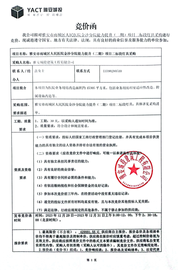 雅安市雨城區(qū)人民醫(yī)院分院能力提升(二期)項(xiàng)目二標(biāo)段燈具采購競(jìng)價(jià)公告