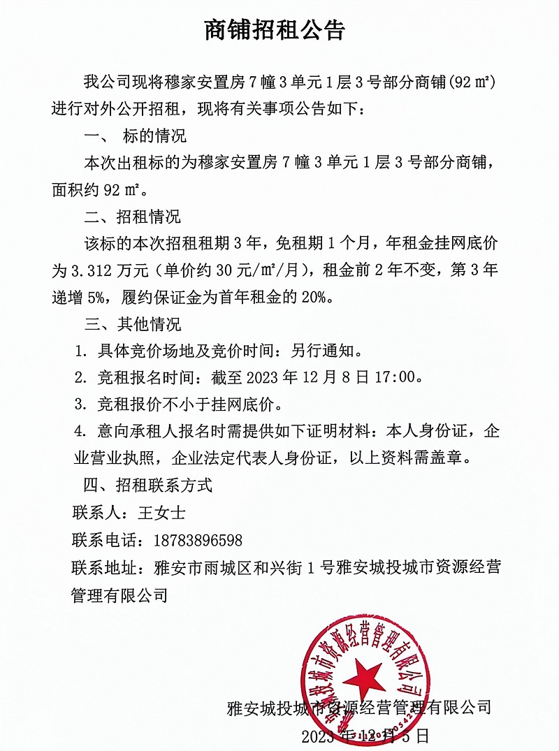 穆家安置房7幢3單元1層3號部分商鋪招租公告