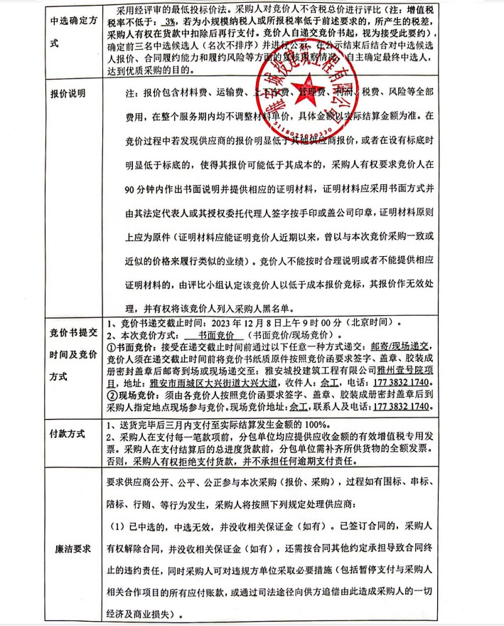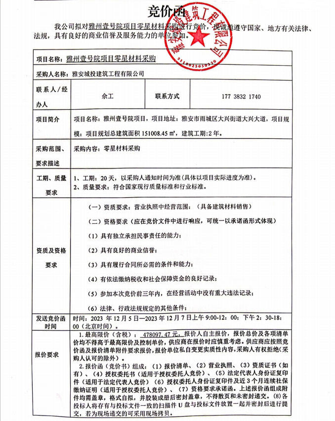 雅州壹號(hào)院項(xiàng)目零星材料采購競(jìng)價(jià)公告