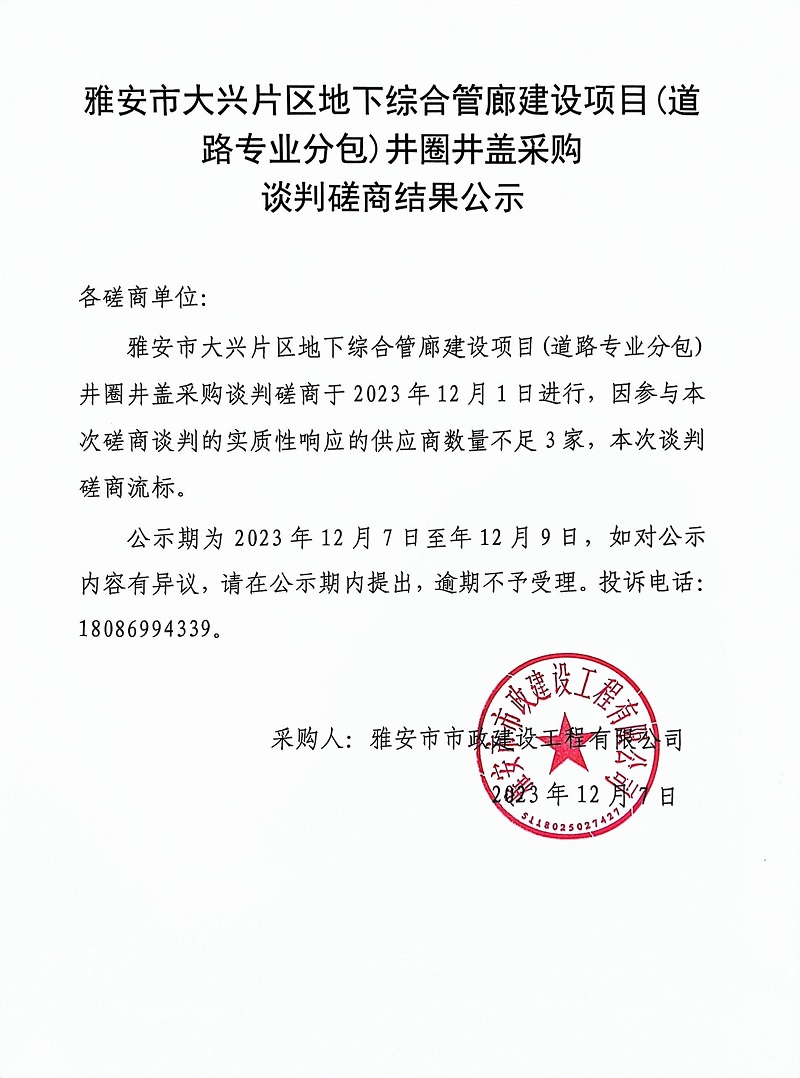 雅安市大興片區(qū)地下綜合管廊建設(shè)項目(道路專業(yè)分包)井圈井蓋采購談判磋商結(jié)果公示