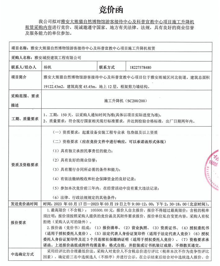 雅安大熊貓自然博物館游客接待中心及科普宣教中心項目施工升降機租賃采購競價公告