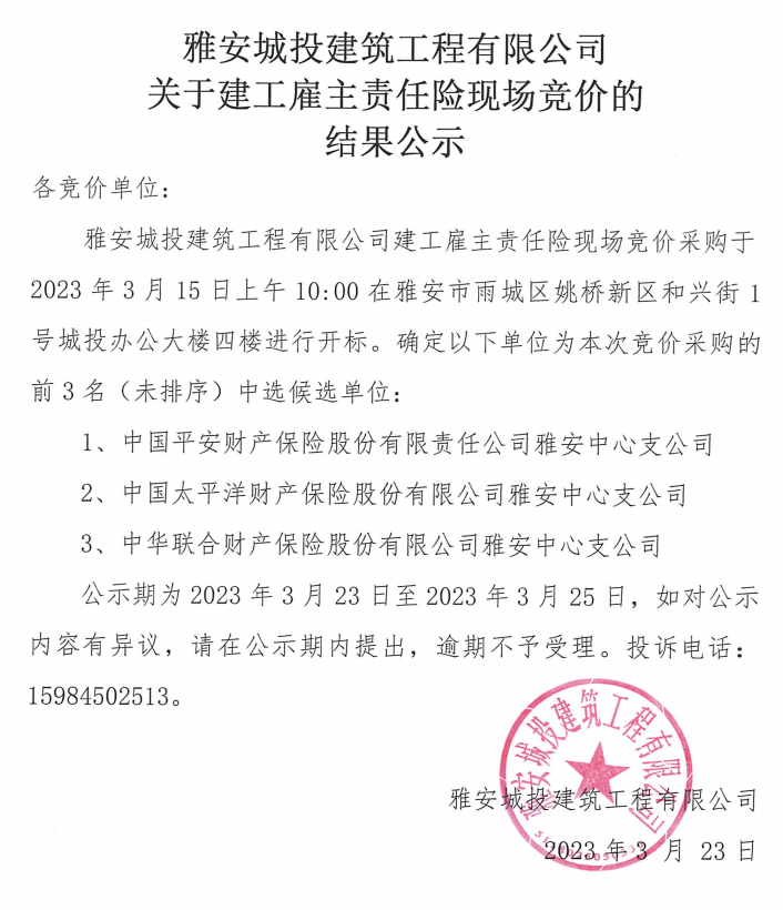 雅安城投建筑工程有限公司關(guān)于建工雇主責(zé)任險(xiǎn)現(xiàn)場競價(jià)的結(jié)果公示