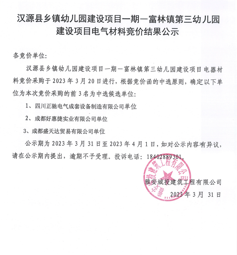 漢源縣鄉(xiāng)鎮(zhèn)幼兒園建設項目一期一富林鎮(zhèn)第三幼兒園建設項目電氣材料競價結果公示