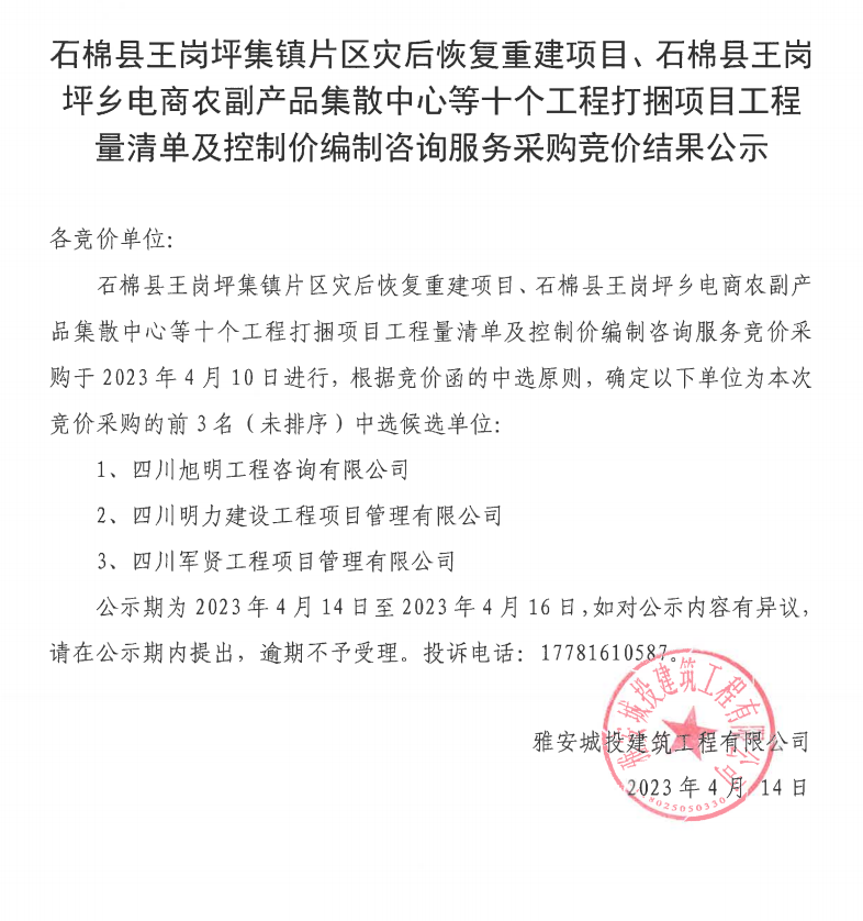 石棉縣王崗坪集鎮(zhèn)片區(qū)災(zāi)后恢復(fù)重建項(xiàng)目、石棉縣王崗坪鄉(xiāng)電商農(nóng)副產(chǎn)品集散中心等十個(gè)工程打捆項(xiàng)目工程量清單及控制價(jià)編制咨詢服務(wù)采購競(jìng)價(jià)結(jié)果公示
