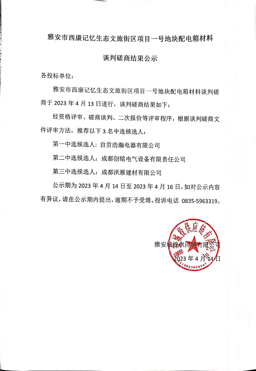 雅安市西康記憶生態(tài)文旅街區(qū)項(xiàng)目一號(hào)地塊配電箱材料談判磋商結(jié)果公示