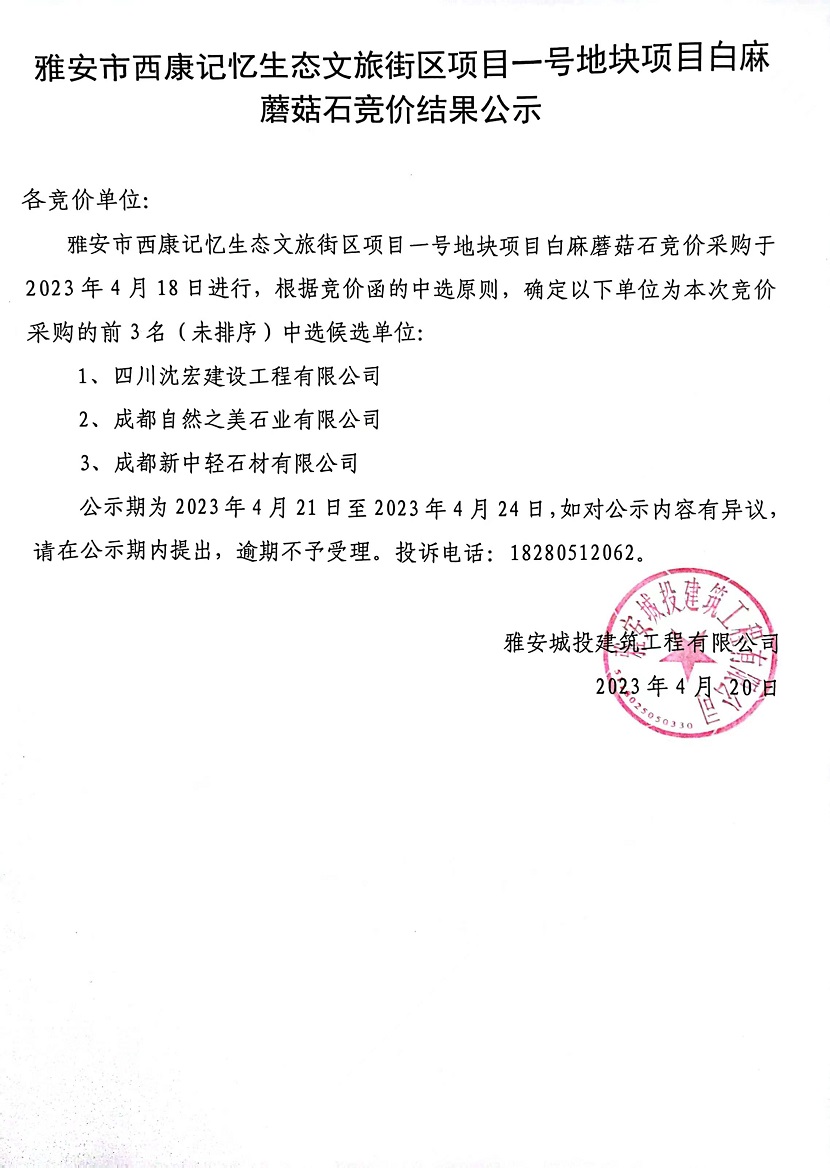 雅安市西康記憶生態(tài)文旅街區(qū)項(xiàng)目一號(hào)地塊項(xiàng)目白麻蘑菇石競(jìng)價(jià)結(jié)果公示