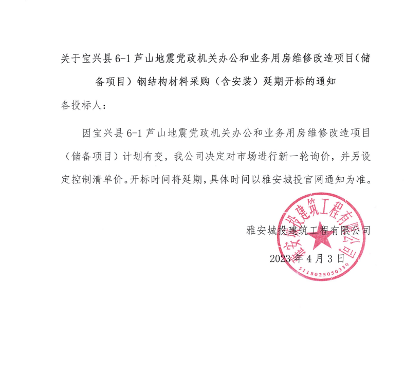 關(guān)于寶興縣6-1蘆山地震黨政機關(guān)辦公和業(yè)務用房維修改造項目(儲備項目)鋼結(jié)構(gòu)材料采購(含安裝)延期開標的通知