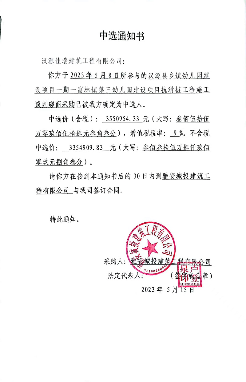 漢源縣鄉(xiāng)鎮(zhèn)幼兒園建設(shè)項(xiàng)目一期一富林鎮(zhèn)第三幼兒園建設(shè)項(xiàng)目抗滑樁工程施工談判磋商采購(gòu)中選通知書