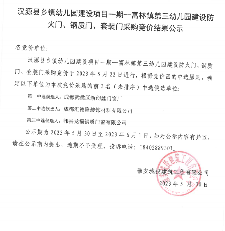 漢源縣鄉(xiāng)鎮(zhèn)幼兒園建設(shè)項目一期--富林鎮(zhèn)第三幼兒園建設(shè)防火門、鋼質(zhì)門、套裝門采購競價結(jié)果公示