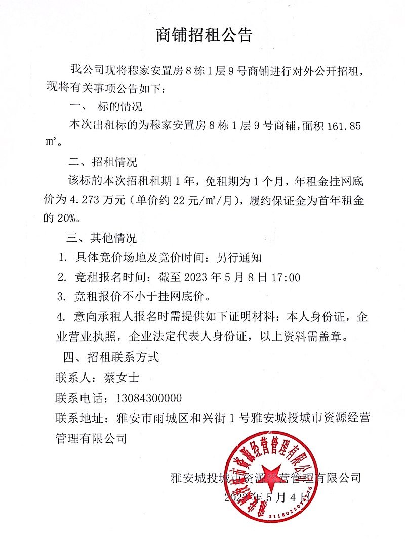 穆家安置房8棟1層9號商鋪招租公告