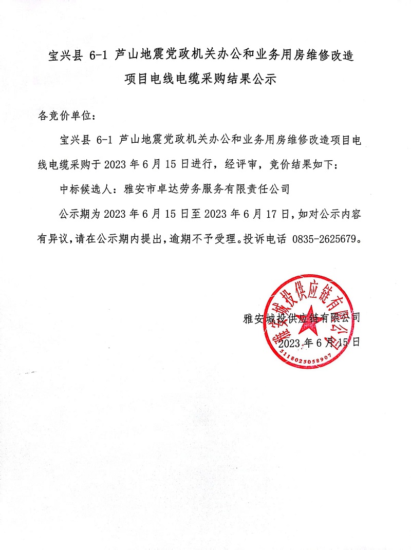 寶興縣 6-1 蘆山地震黨政機關(guān)辦公和業(yè)務(wù)用房維修改造項目電線電纜采購結(jié)果公示