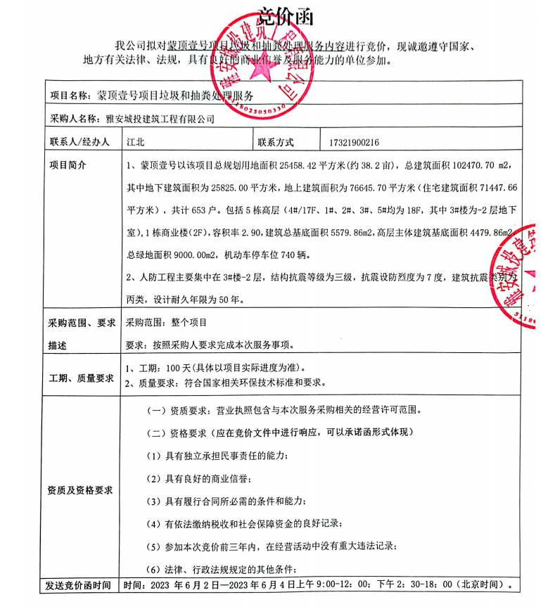 蒙頂壹號項目垃圾和抽糞處理服務競價公告