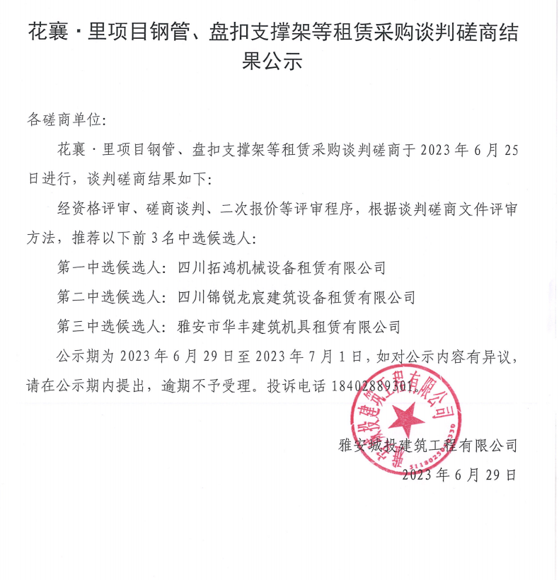 花襄·里項(xiàng)目鋼管、盤扣支撐架等租賃采購談判磋商結(jié)果公示