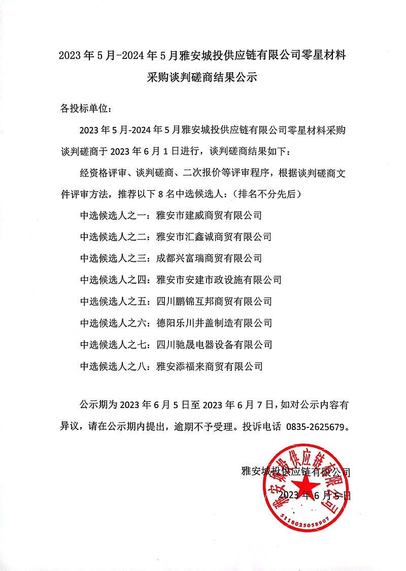 2023年5月-2024年5月雅安城投供應(yīng)鏈有限公司零星材料采購(gòu)談判磋商結(jié)果公示