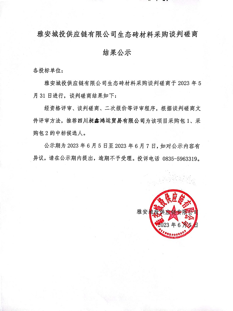 雅安城投供應(yīng)鏈有限公司生態(tài)磚材料采購談判磋商結(jié)果公示