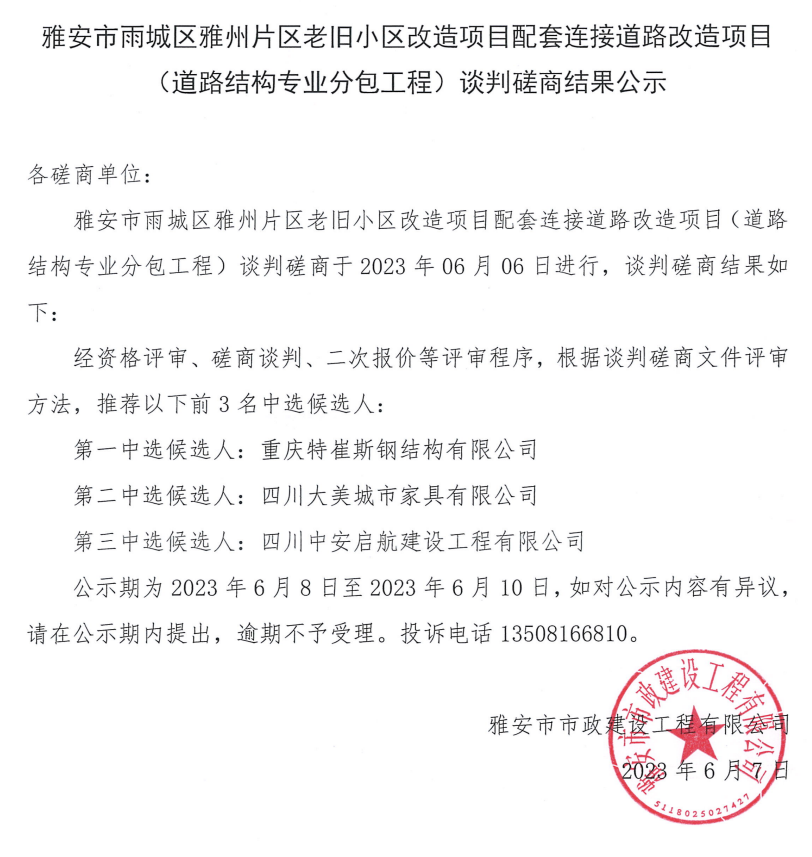 雅安市雨城區(qū)雅州片區(qū)老舊小區(qū)改造項目配套連接道路改造項目(道路結(jié)構(gòu)專業(yè)分包工程)談判磋商結(jié)果公示