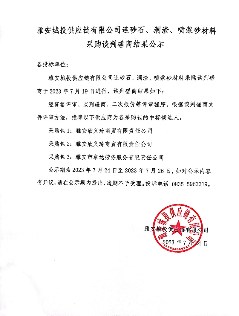 雅安城投供應(yīng)鏈有限公司連砂石、洞渣、噴漿砂材料采購(gòu)談判磋商結(jié)果公示
