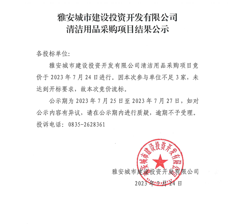 雅安城市建設(shè)投資開發(fā)有限公司清潔用品采購項目結(jié)果公示