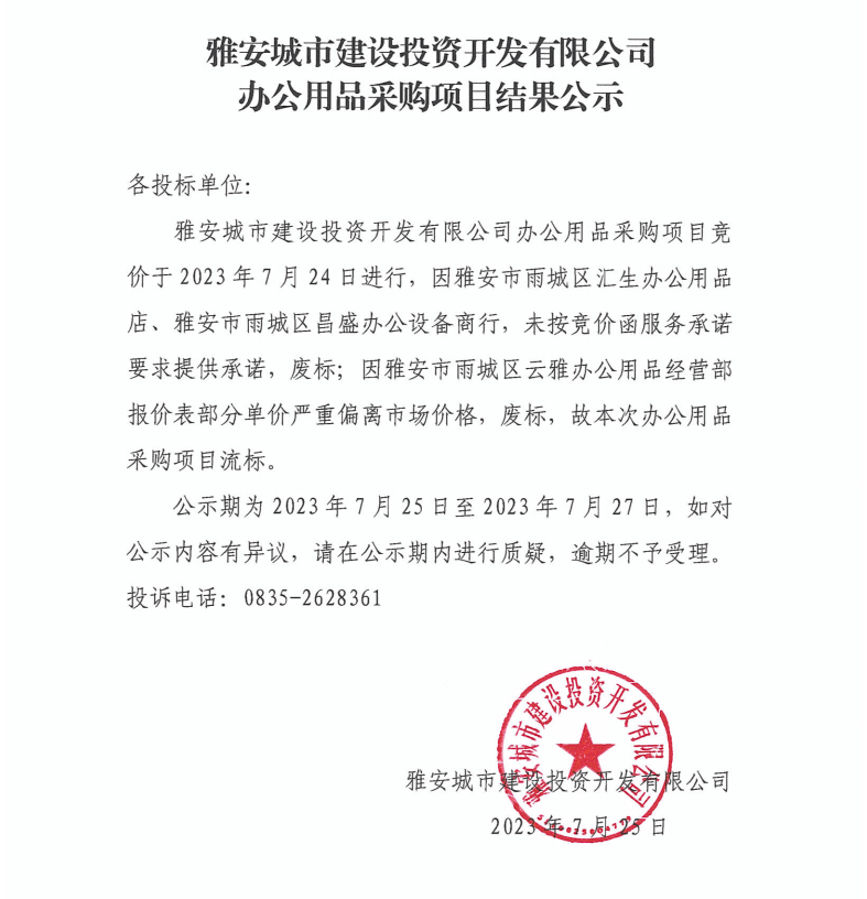 雅安城市建設投資開發(fā)有限公司辦公用品采購項目結果公示