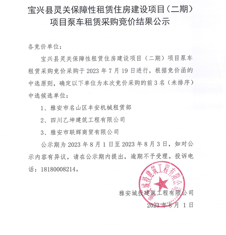 寶興縣靈關(guān)保障性租賃住房建設(shè)項(xiàng)目(二期)項(xiàng)目泵車租賃采購競價(jià)結(jié)果公示