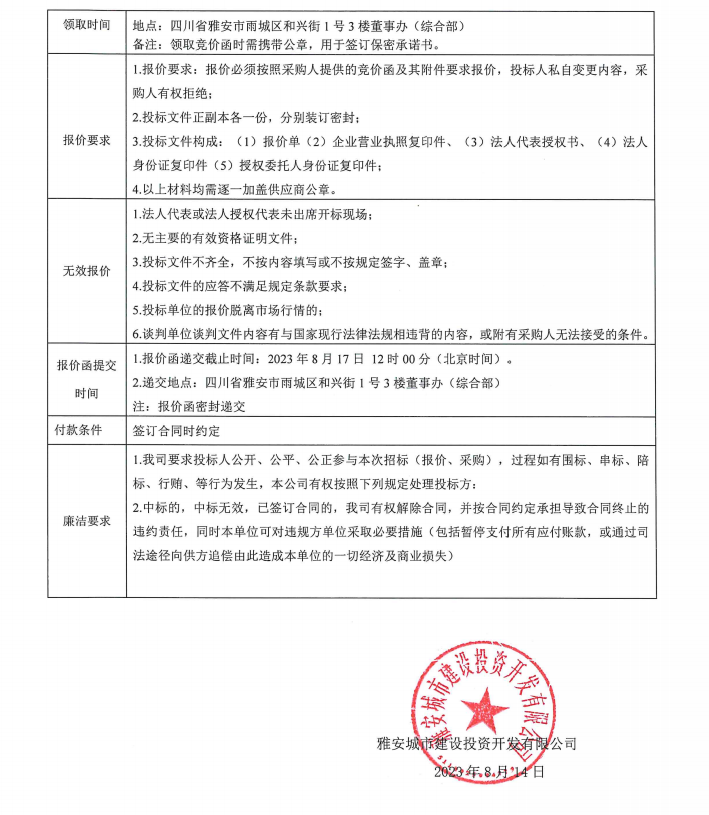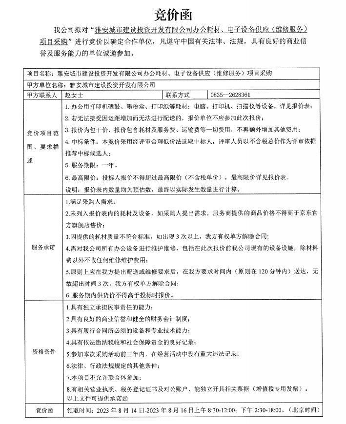 雅安城市建設投資開發(fā)有限公司辦公耗材、電子設備供應(維修服務)項目采購競價公告