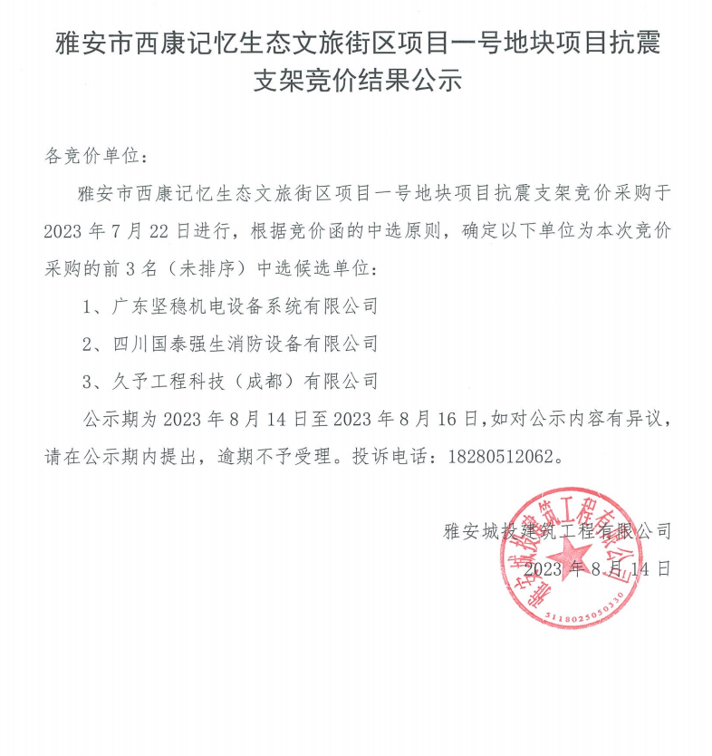 雅安市西康記憶生態(tài)文旅街區(qū)項(xiàng)目一號地塊項(xiàng)目抗震支架競價(jià)結(jié)果公示