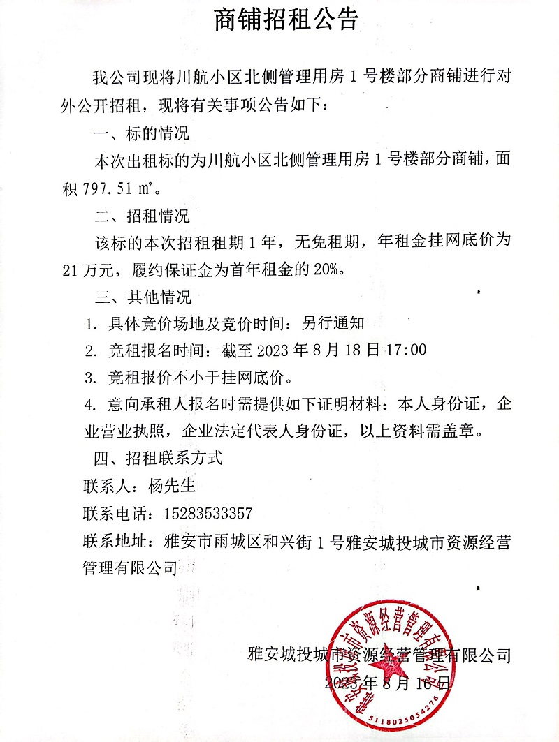 川航小區(qū)北側(cè)管理用房1號(hào)樓部分商鋪招租公告