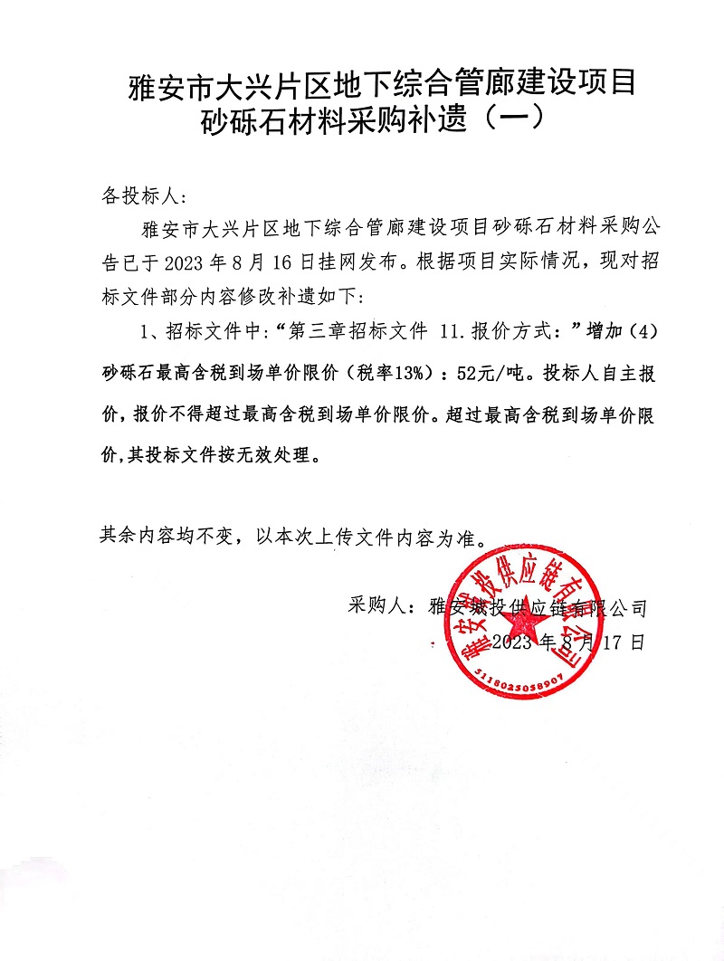雅安市大興片區(qū)地下綜合管廊建設(shè)項(xiàng)目砂礫石材料采購(gòu)補(bǔ)遺(一)