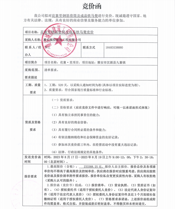 花襄·里鋼筋套筒及成品鐵馬凳競(jìng)價(jià)公告
