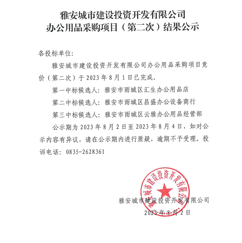 雅安城市建設投資開發(fā)有限公司辦公用品采購項目(第二次)結果公示