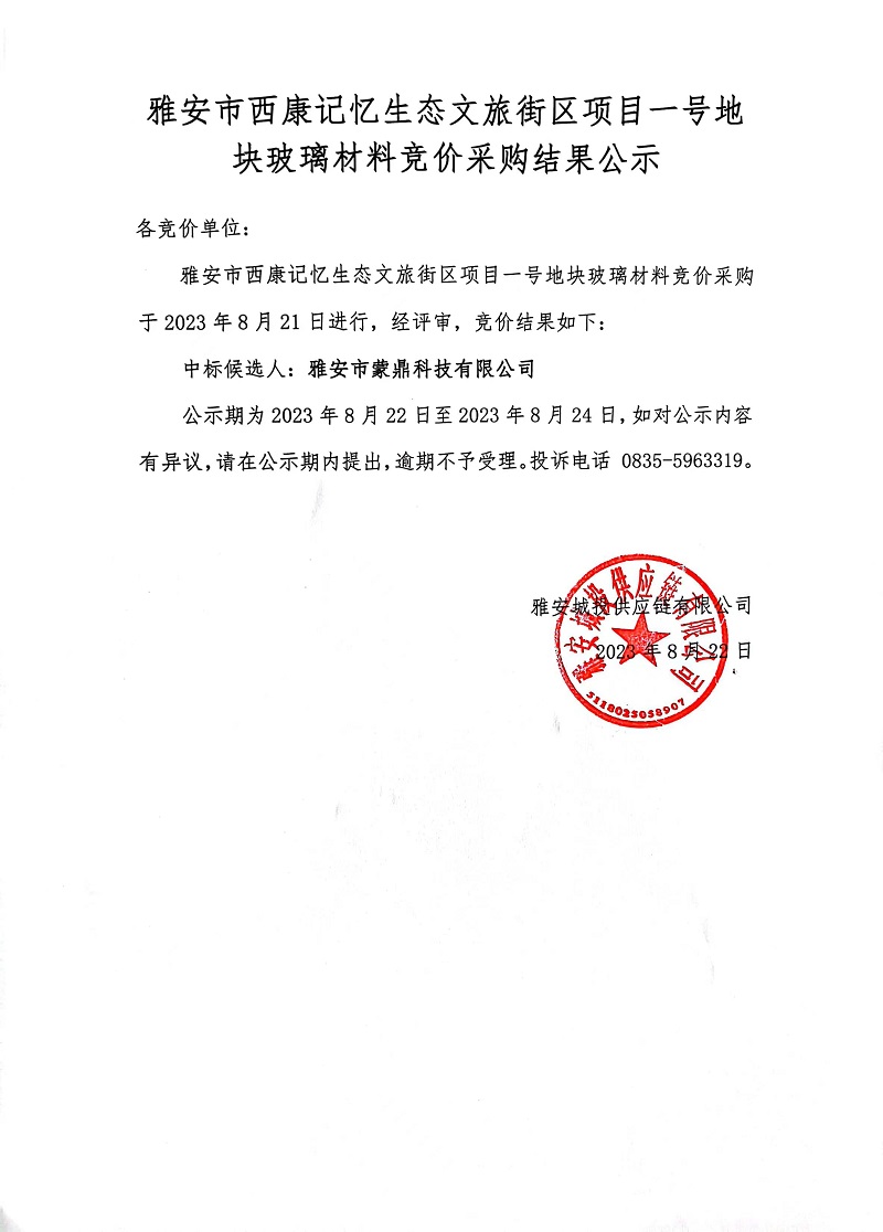 雅安市西康記憶生態(tài)文旅街區(qū)項(xiàng)目一號地塊玻璃材料競價(jià)采購結(jié)果公示