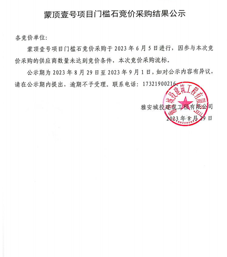 蒙頂壹號(hào)項(xiàng)目門檻石競(jìng)價(jià)采購(gòu)結(jié)果公示