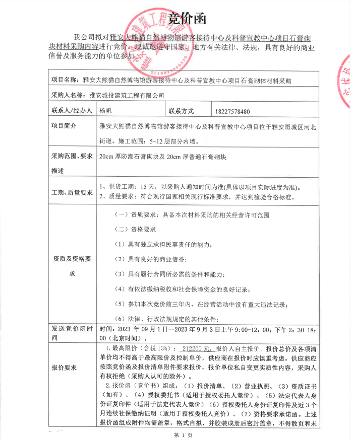 雅安大熊貓自然博物館游客接待中心及科普宣教中心項(xiàng)目石膏砌塊材料采購內(nèi)容競價公告